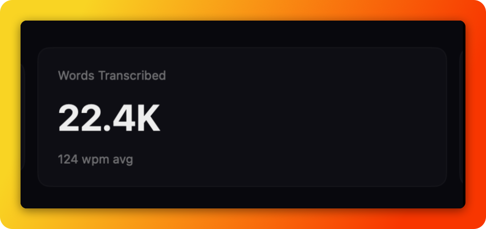 For example, I’ve spoken 22.4k words at an average of 124 wpm, with over 9 hours and 30 minutes of typing saved.